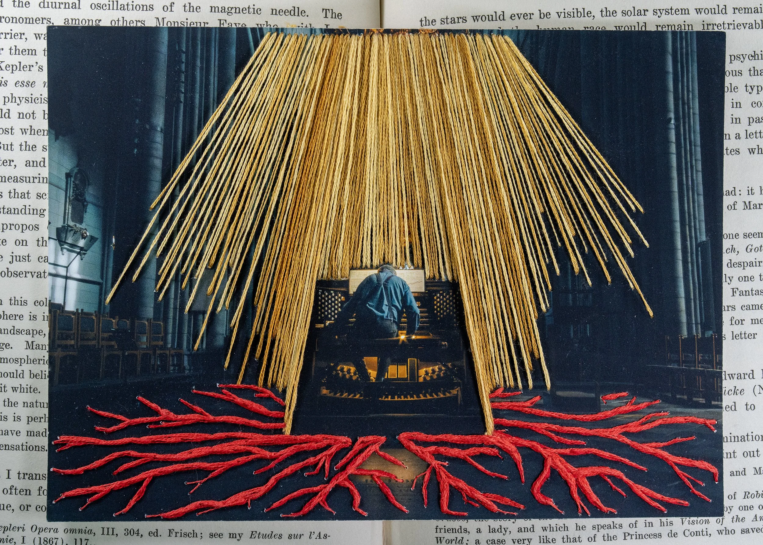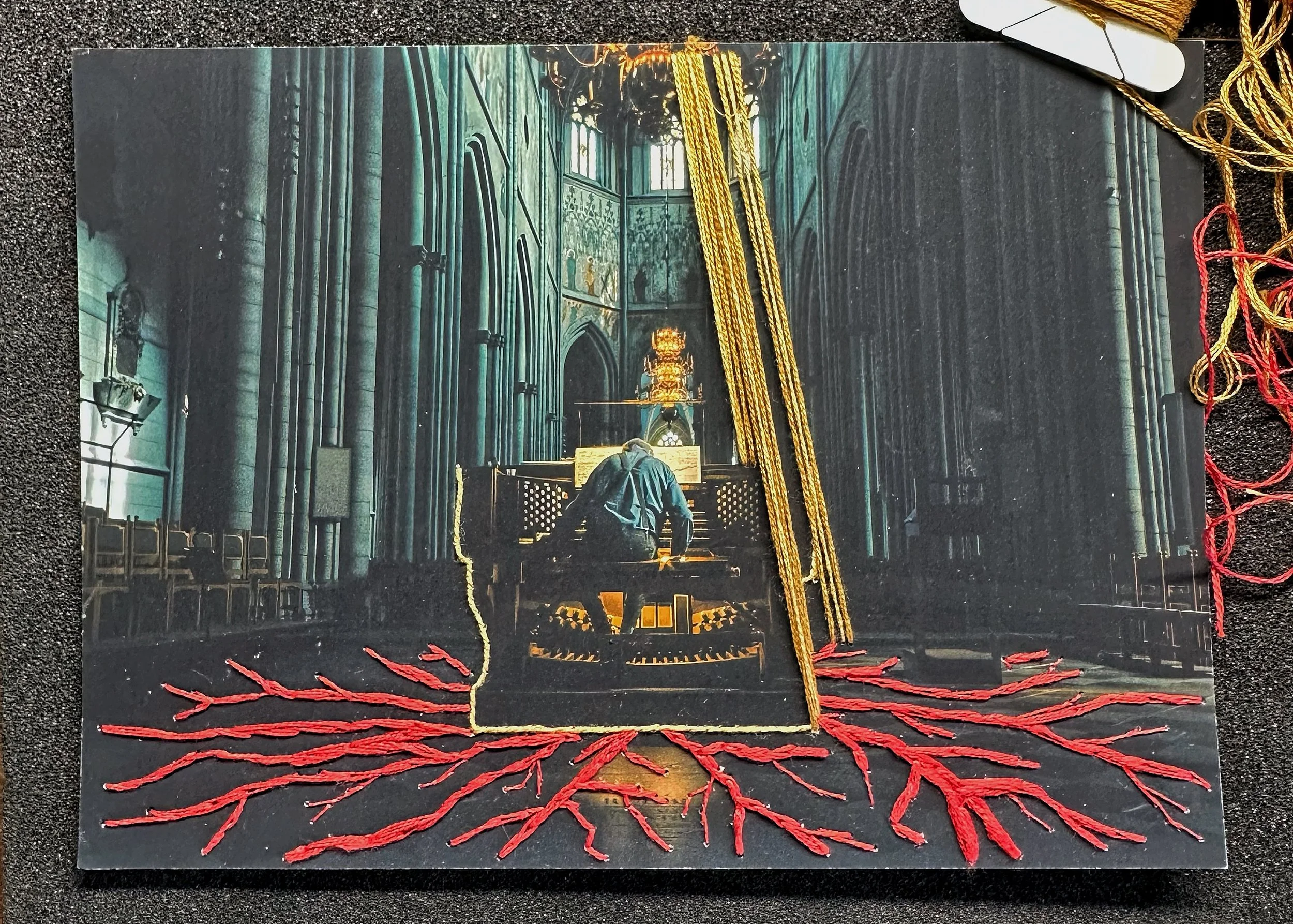 I landed on using between 1 and 4 strands. 4 strands on the fissures closer, where the viewer would be standing, and 1 for those further away near the back of the organ. Those 6 strands I had originally used were cut out and replaced with 4 strands, it honestly felt quite invigorating to destroy part of the work i had spent time on. Part of me even toyed with the idea of leaving the cut strands dangling as proof of my own destruction. I decided against that as despite wanting the piece to be raw, I was enjoying the process of creating and learning to create a more 3D effect with some thread painting which I had begun to explore before I made the cuts. This wasn’t the only part which I decided to cut and remove. Some of the beams of light also suffered a similar fate, I took the scissors to several of these too. Removing threads that were too thick or overlapping others, a lot of the holes at the top of the piece have multiple threads in them to help create a fuller effect that radiates out so I could make some small adjustments there. If I was to do this piece again I wouldn’t make that section so dense. As you may have noticed, in the original design I had put all the beams behind the organ to again lean into that sense of depth. Due to some early on mistakes I had to adjust that design to compensate which resulted in the beams coming across over both sides and giving the organ a little bit of a house shape. I don’t hate it, but it wasn’t intended. A happy little accident of sorts.